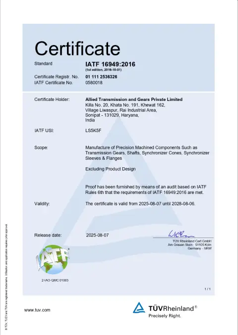Allied Transmission & Gears is an ISO 9001:2015 and IATF 16949 and ZED certified company. We adhere to global standard processes through our integrated management systems.
